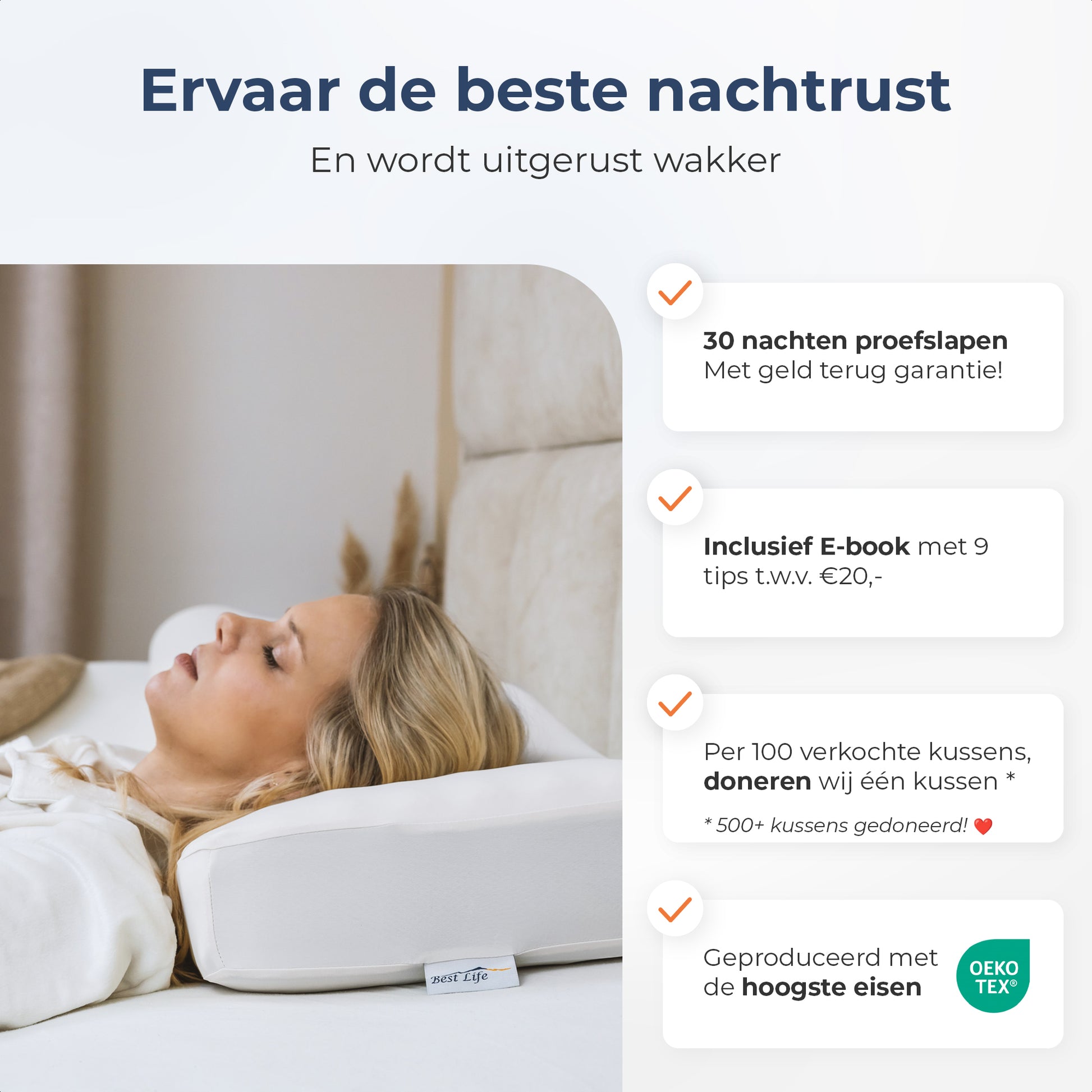 Het gebruik van een Best Life hoofdkussen is vrij eenvoudig. Elk hoofdkussen van Best Life heeft een hoge en lage ligging. Probeer beide kanten uit en test welke kant het best bij jou past. Het is van belang dat je nek in lijn blijft met de rest van je lichaam.