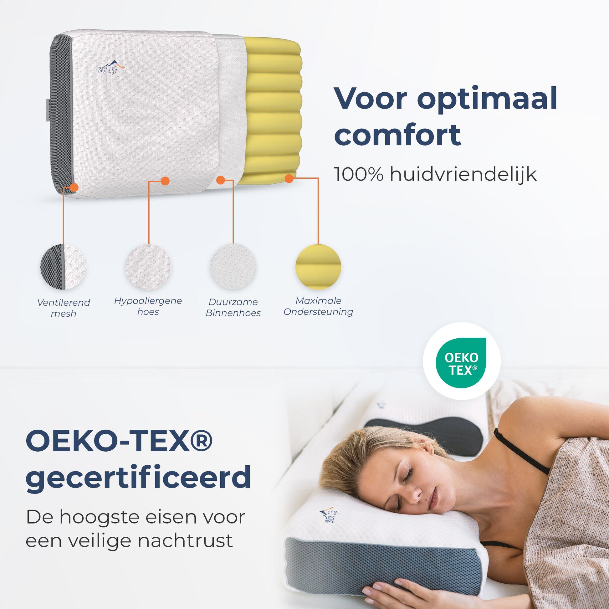 Door het BL-Comfort foam zal je lichaam altijd de juiste ondersteuning krijgen. Door de ventilatie en het gebruik van duurzame materialen, zorgt het kussen ervoor dat het nooit te warm wordt. Zelfs op de hete zomerdagen.