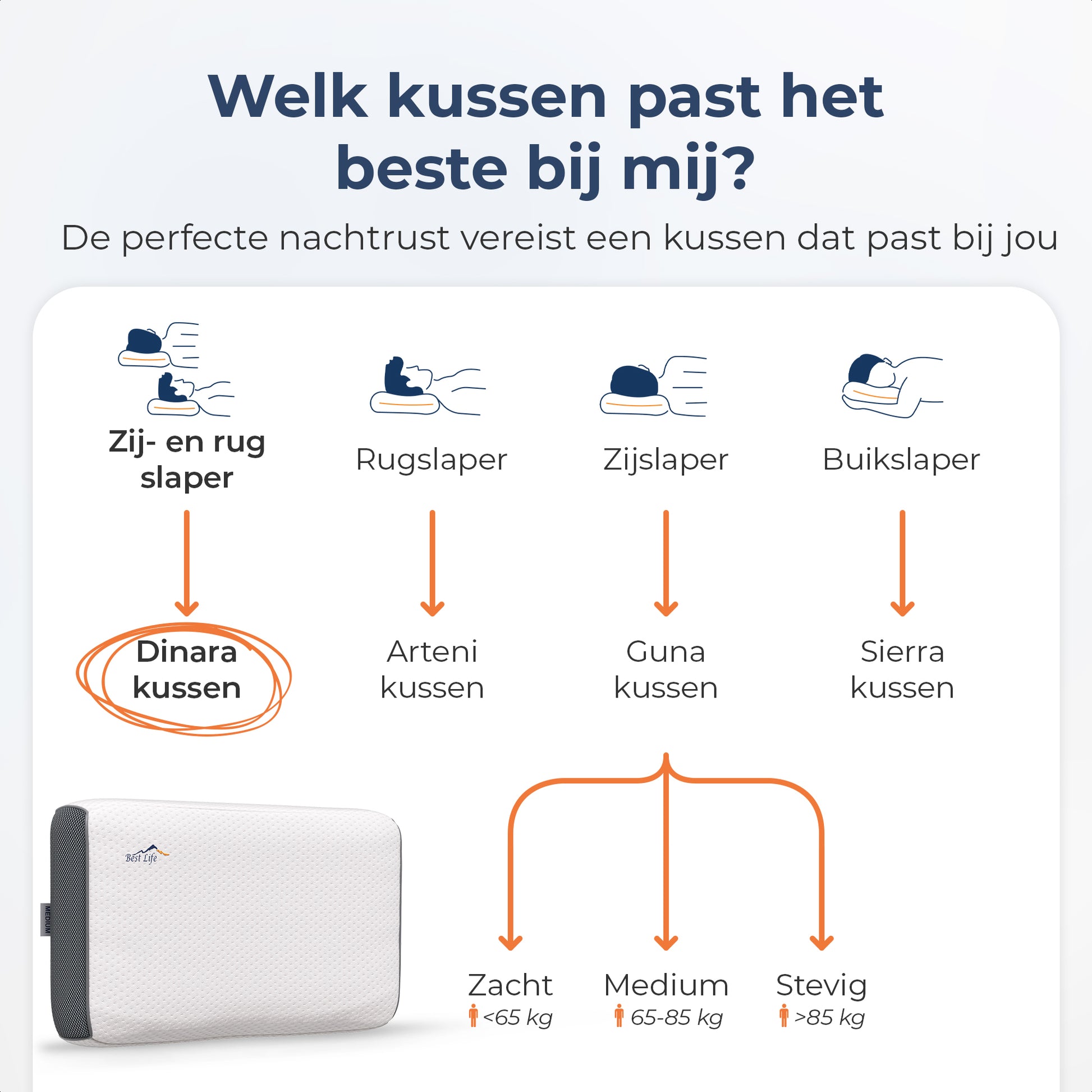In het kort, ja! Het Dinara kussen is speciaal gemaakt voor mensen die vaker wisselen van slaappositie tijdens het slapen. Of je nu op je buik, op je zij, of op je rug slaapt, het Dinara kussen is ideaal voor jou.