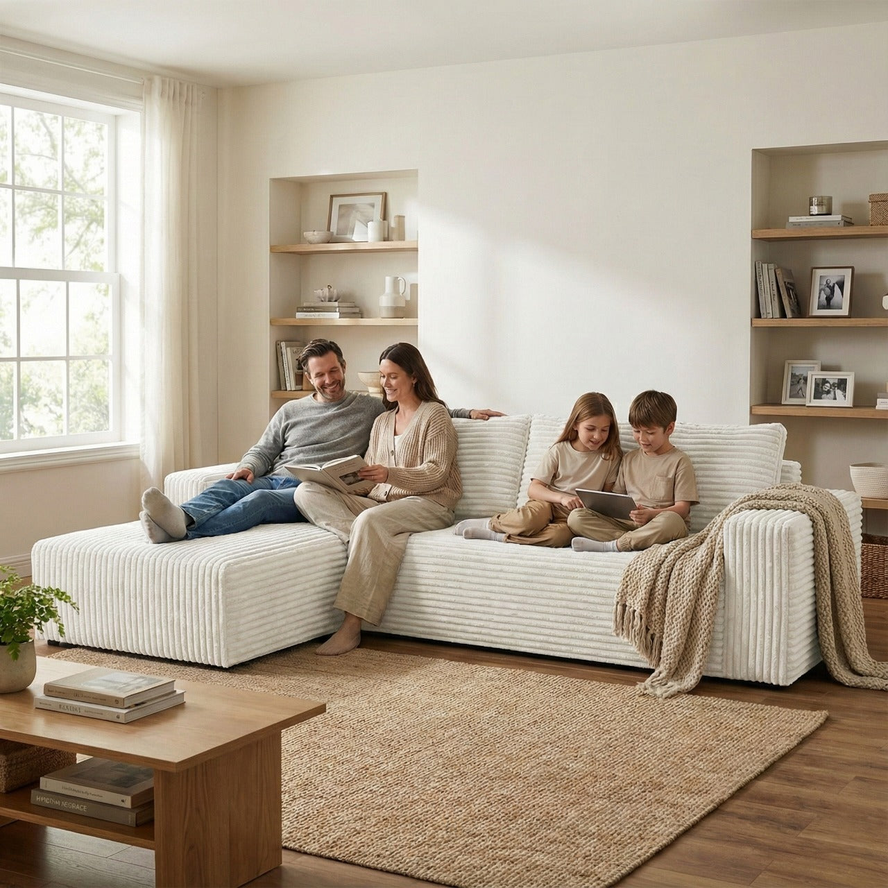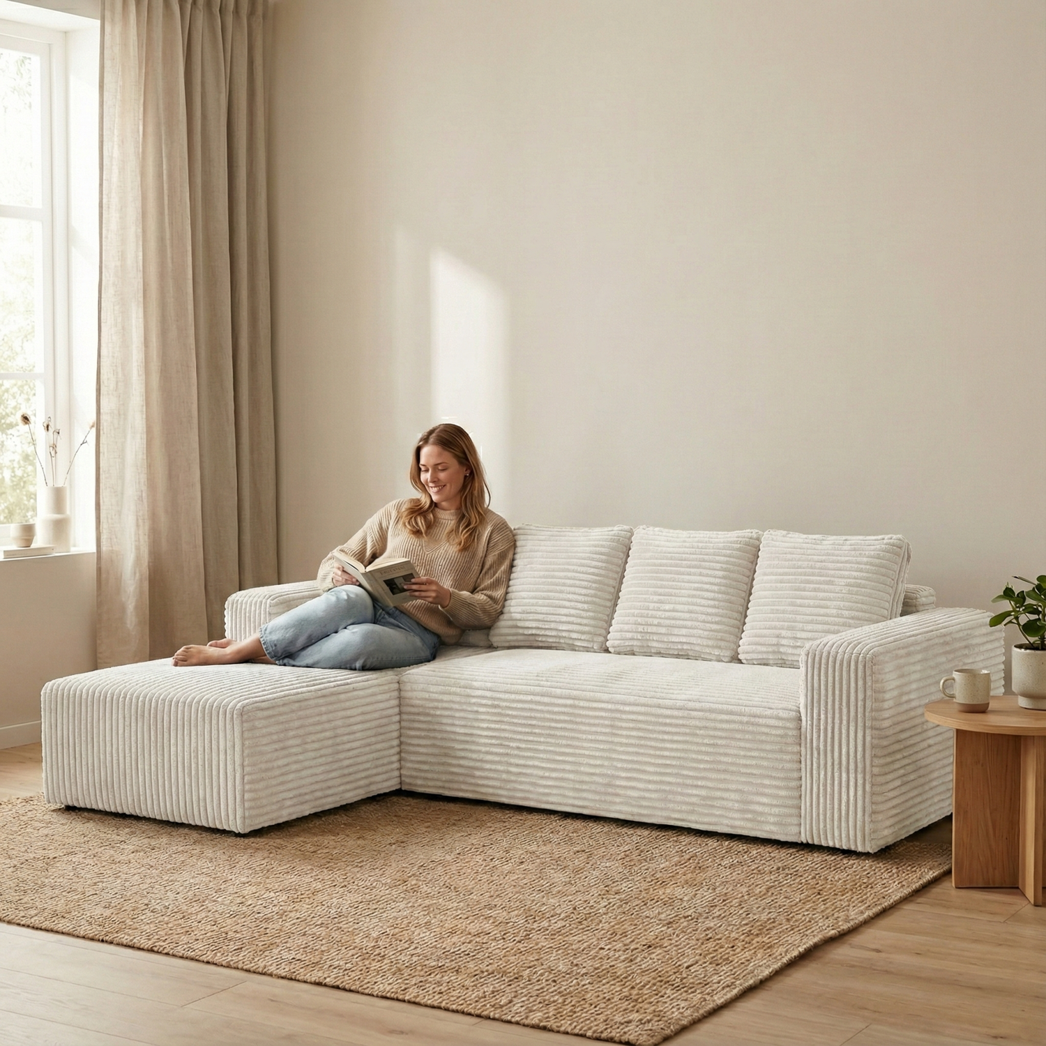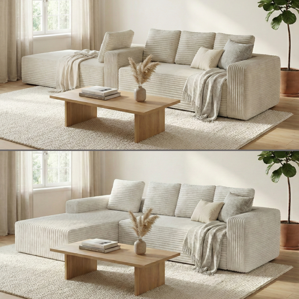 De omkeerbare chaise longue maakt de L-vorm flexibel, en het lage, brede design geeft de sofa een luxe en moderne uitstraling.