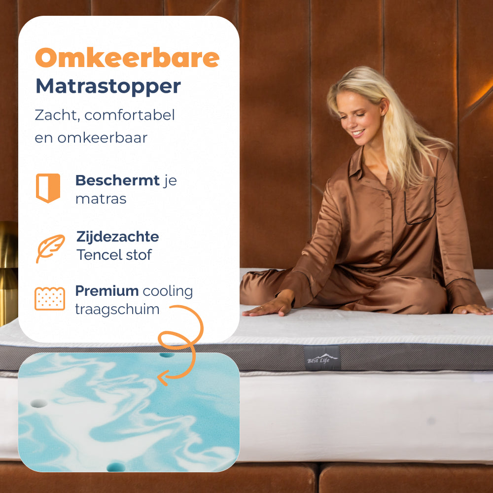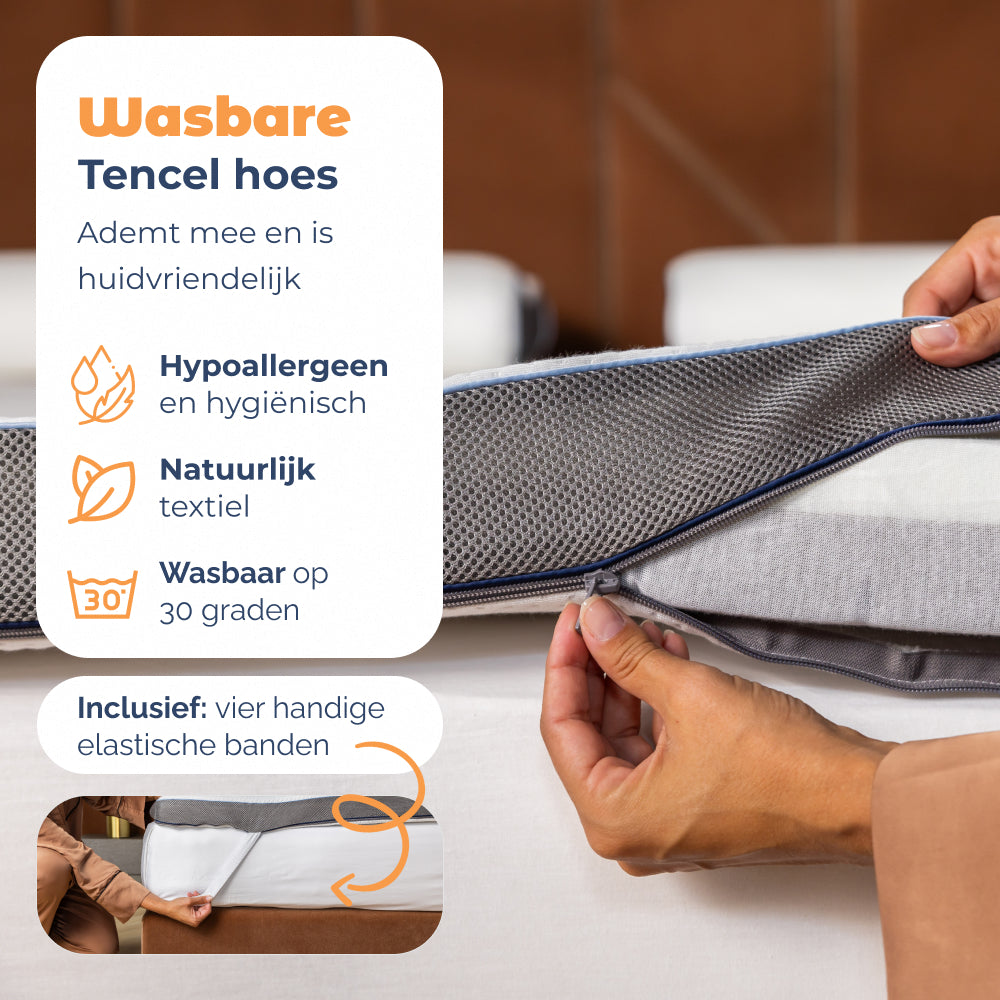 De topper is voorzien van een hoogwaardige Tencel hoes die zowel vocht- als temperatuurregulerend is. Dit zorgt voor een optimale slaapomgeving, zelfs tijdens warme zomernachten. Bovendien is de hoes gemakkelijk afneembaar en wasbaar, waardoor je altijd kunt genieten van een frisse topper.