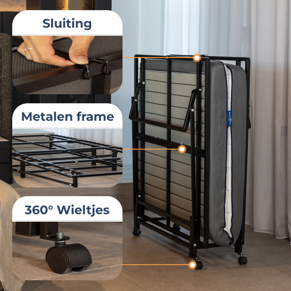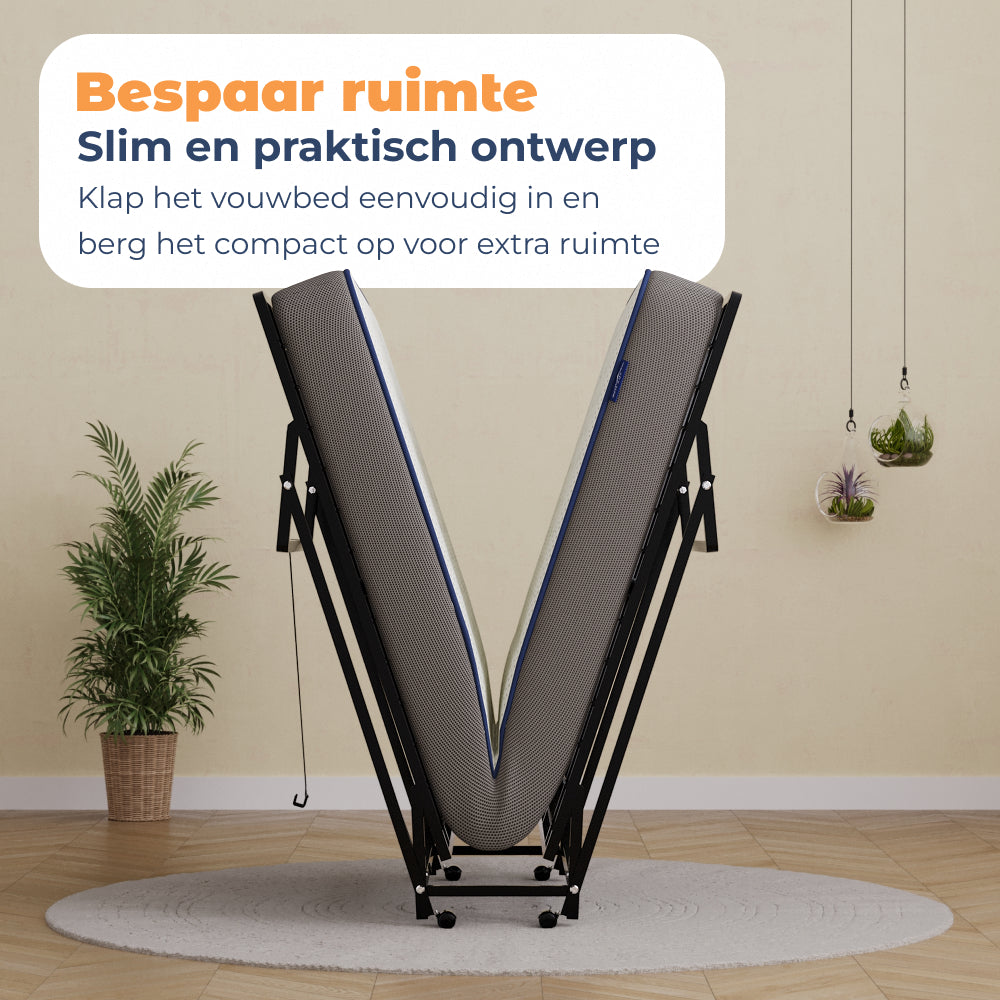 Uitgeklapt heeft het vouwbed een volwaardige 1-persoonsmaat van 90 × 200 cm – dezelfde afmeting als een standaard eenpersoonsmatras. Hierdoor biedt het hetzelfde slaapoppervlak en comfort als een regulier bed. Ingeklapt neemt het bed aanzienlijk minder ruimte in, waardoor je het gemakkelijk kunt opbergen in een kast, berging of hoek van de kamer.