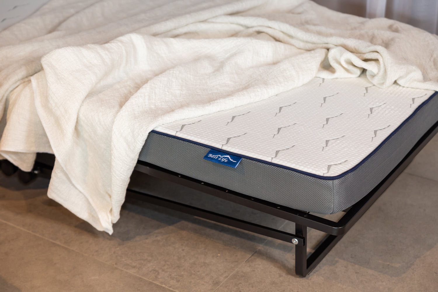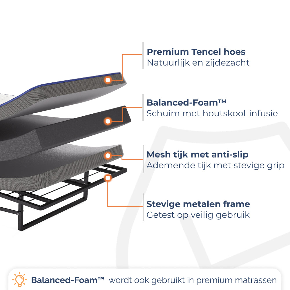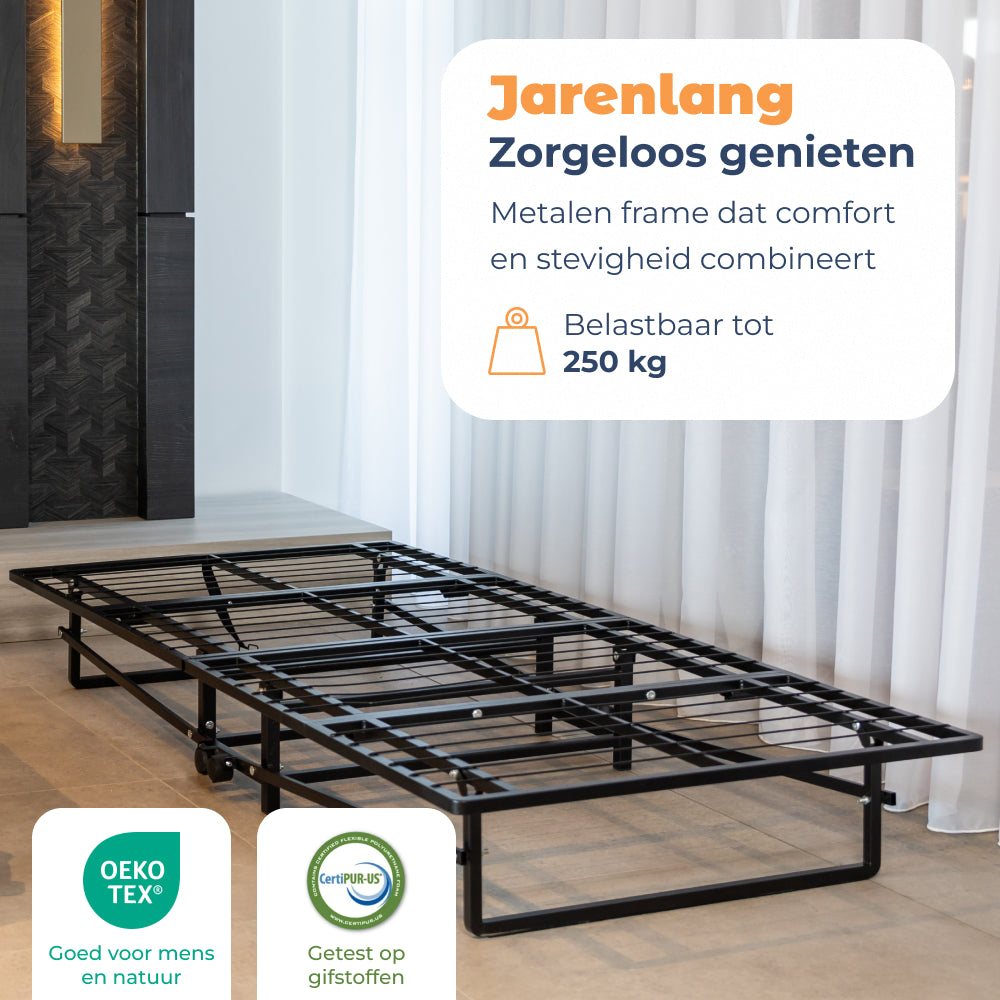 Het bed wordt geleverd met een 10 cm premium Balanced-Foam™ matras, hetzelfde materiaal dat gebruikt wordt in kwaliteitsmatrassen. Het biedt veerkrachtige ondersteuning en vormt zich licht naar je lichaam. In combinatie met de metalen rasterbodem ervaar je een stabiele én comfortabele nachtrust — ideaal voor gasten, studentenkamers of tijdelijk gebruik.