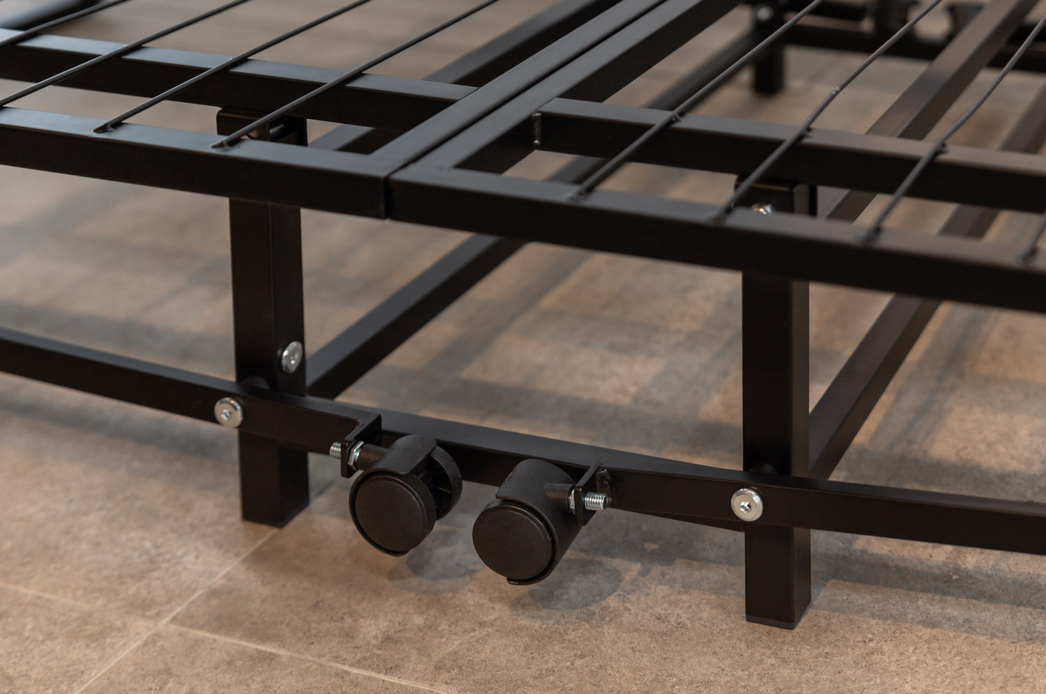 De wieltjes klappen automatisch in en uit en maken het bed eenvoudig verplaatsbaar.